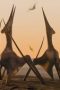 Within the snow-covered forest, a tense standoff develops between ancient rivals, Pachyrhinosaurus and Nanuqsaurus.